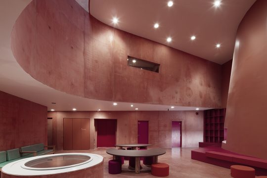 L’architecture est dessinée comme un écrin ; le bâtiment se déforme sous l’influence des arbres et il entre en résonance avec le paysage. Pas de conflit ici, mais plutôt une relation harmonieuse avec le contexte. La grande façade qui regarde l’Opéra est dessinée comme une sculpture géante à l’échelle du site. La transparence complète du rez-de-chaussée contraste avec l’opacité presque totale du volume supérieur, qui semble être en lévitation. L’architecte, Dominique Coulon & associés a cherché une architecture qui, par sa plasticité, évoque son contenu.