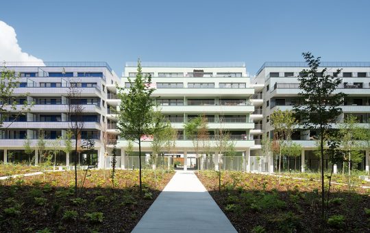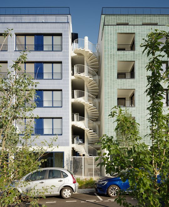 La résidence comprend 212 logements répartis sur R+5, quasiment tous dotés d’une terrasse privative de 2 mètres de large. La distribution des logements propose une expérience atypique : on entre par le jardin, on emprunte un escalier extérieur, puis on traverse un palier pour accéder directement à son logement par la terrasse.